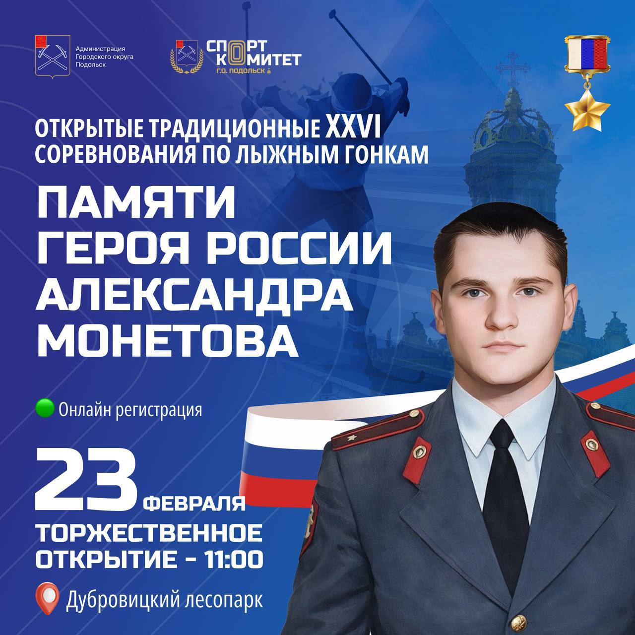 Открытые традиционные XXVI соревнования по лыжным гонкам памяти Героя России Александра Монетова состоятся 23 февраля в Дубровицком лесопарке!